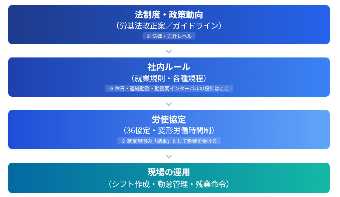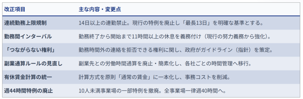 例えば、連続勤務の上限や法定休日の特定方法が変われば、結果として時間外・休日労働の枠組みにも影響が生じます。