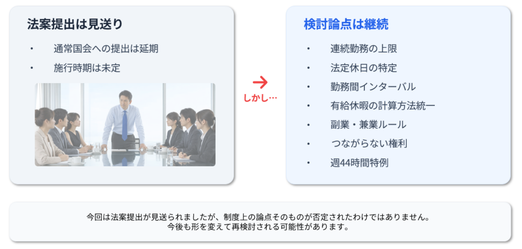 このように、健康確保(規律強化)と柔軟性(多様化対応)をどう両立させるかは調整が難しく、制度化の設計において検討課題が多く残っていたことも、提出見送りの背景の一つと考えられます。