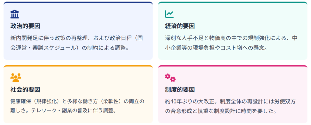 労働基準法の抜本改正が約40年ぶりという制度面での大きな見直しであったことも、見送りの背景として挙げられます。