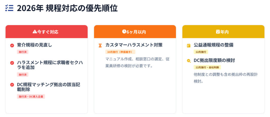 2026年の法改正は施行時期が分散しているため、優先度を整理して計画的に対応することが重要です。