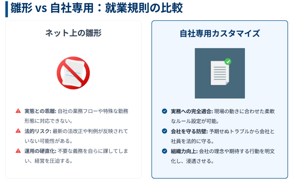 ひな形の就業規則は標準的な内容しか含まれておらず、自社の実態・業種・雇用形態に合っていないことが多いためです。