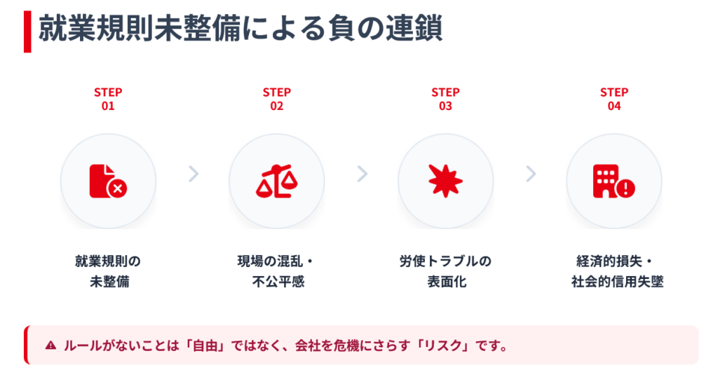 法的な作成義務がないため、「作らなくても問題ない」と思われがちです。しかし実務では、トラブルが起きたとき、会社を守るルールが存在しない状態になります。