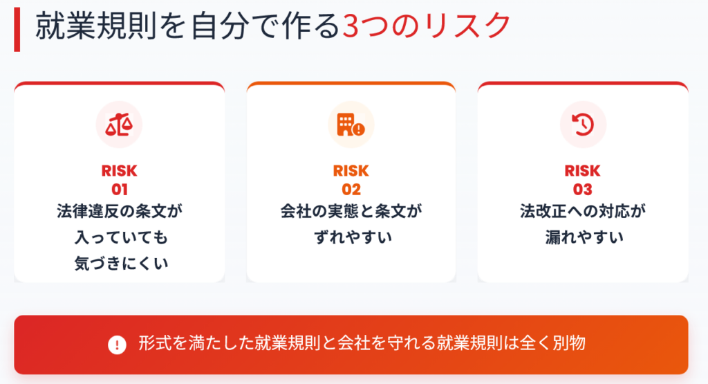 就業規則を自社で作成すること自体は可能です。しかし、実際には次の3つのリスクがあります。