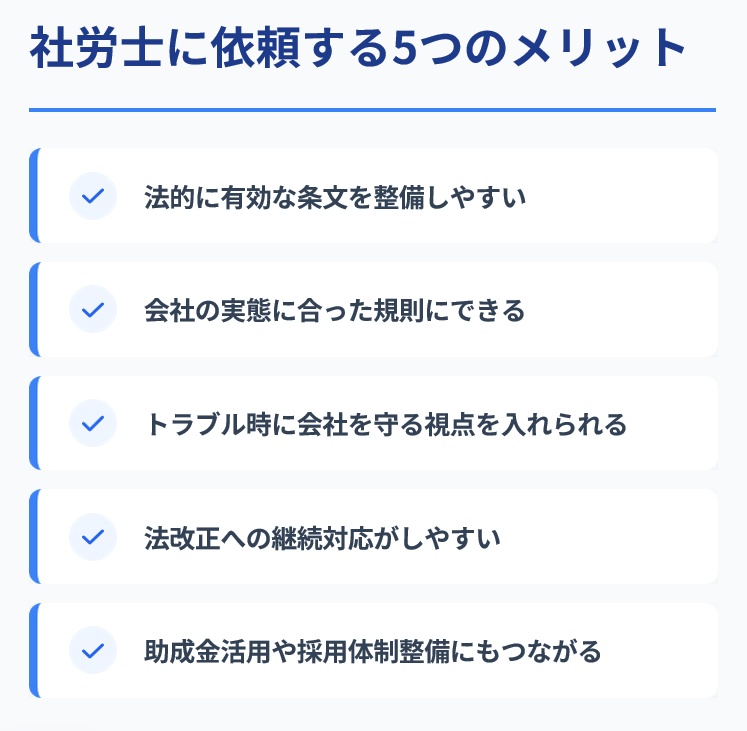 社労士は、法令・通達・実務運用を踏まえて条文を作成・確認します。見た目だけ整っているが法的には危うい就業規則を避けやすくなります。