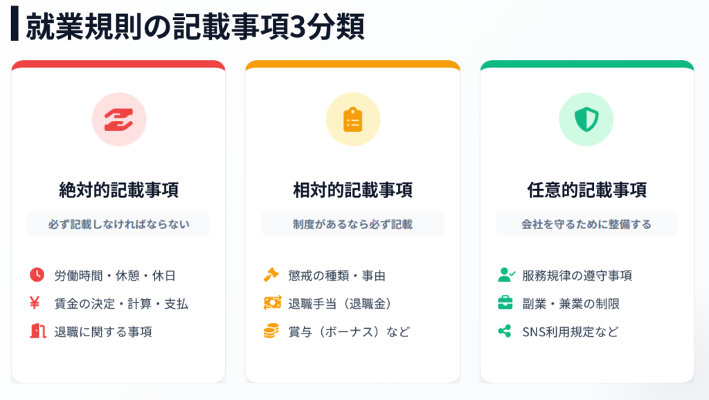就業規則の記載事項は、次の3つに分かれます。