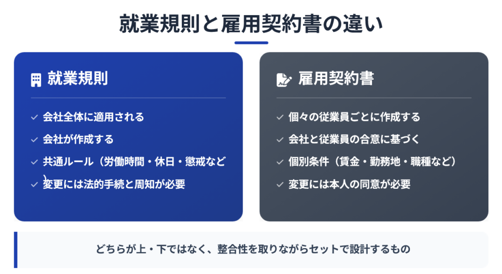 両者の違いを一言でいえば、就業規則は「会社全体の基準」、雇用契約書は「個人ごとの条件」です。