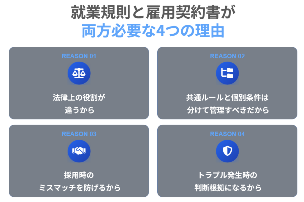 就業規則は、一定規模以上の事業場で作成・届出義務がある社内ルールです。一方、雇用契約書や労働条件通知書は、採用時に個別条件を明示するために必要です。つまり、代替関係ではなく、役割分担の関係です。どちらか一方だけで済ませる発想自体に無理があります。